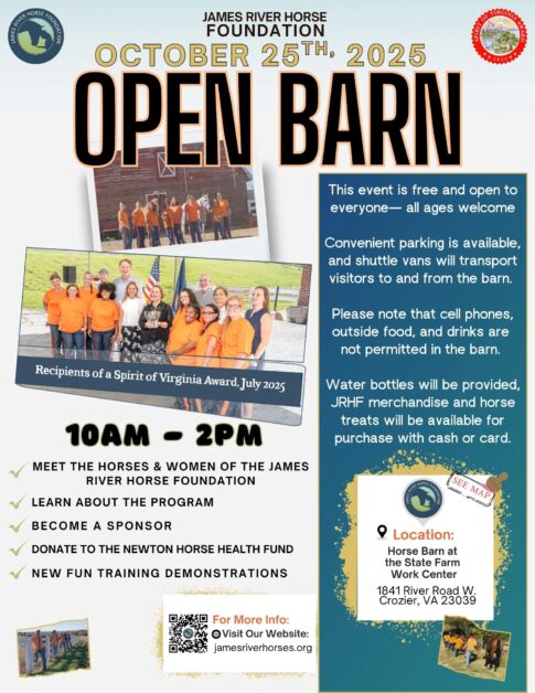 Come spend time meeting with the horses in the James River Horse Foundation. Learn how our program benefits retired racehorses and the women who care for them.